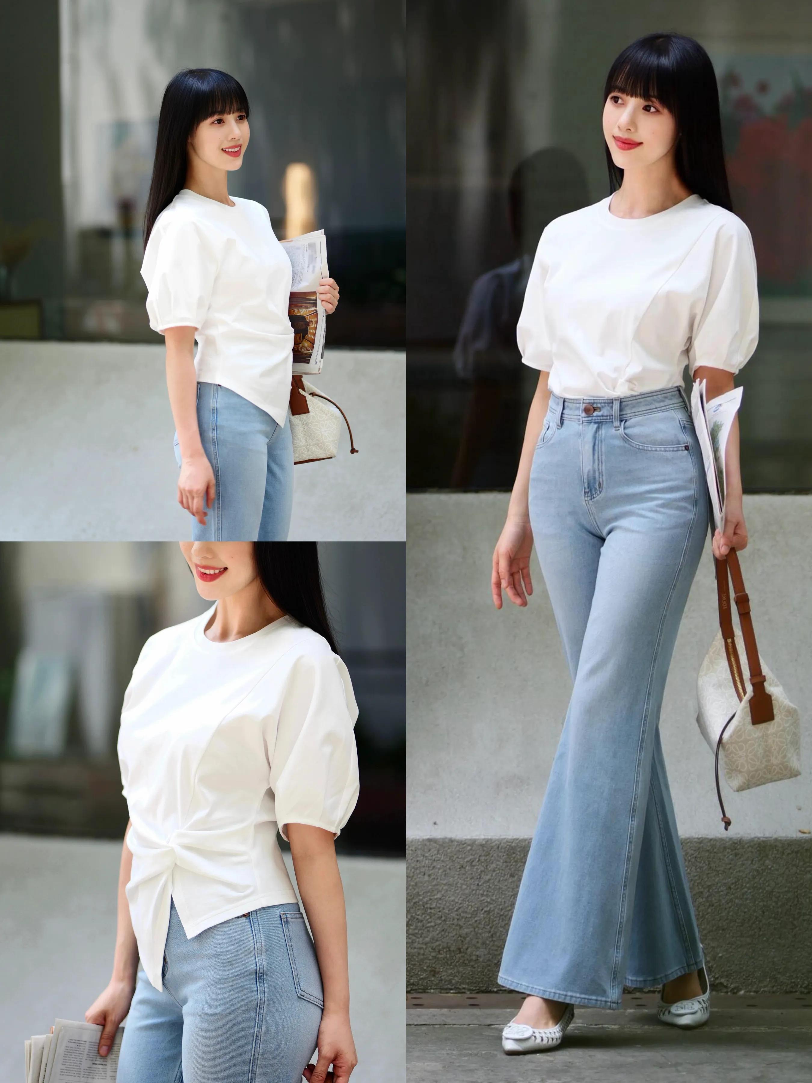 可选上面这种不对称设计的灯笼袖微宽松白衬衫,搭配上一条蓝色的微喇叭牛仔裤,脚踩银灰色平底单鞋,就可以轻松勾勒出你的好身形。