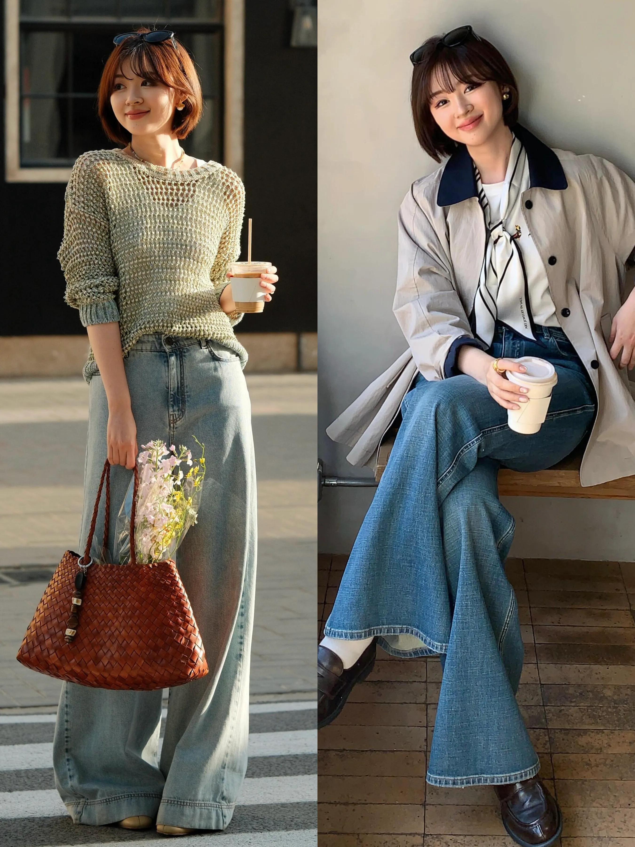 穿衣打扮千万不要盲目跟风,适合别人的不一定适合自己,一定要根据自己的身材来决定。例如上面这一条牛仔阔腿裤,穿在身上慵懒随性,确实可以遮住胯宽腿粗,拥有大长腿,若是个子小巧,就会显得拖沓邋遢。