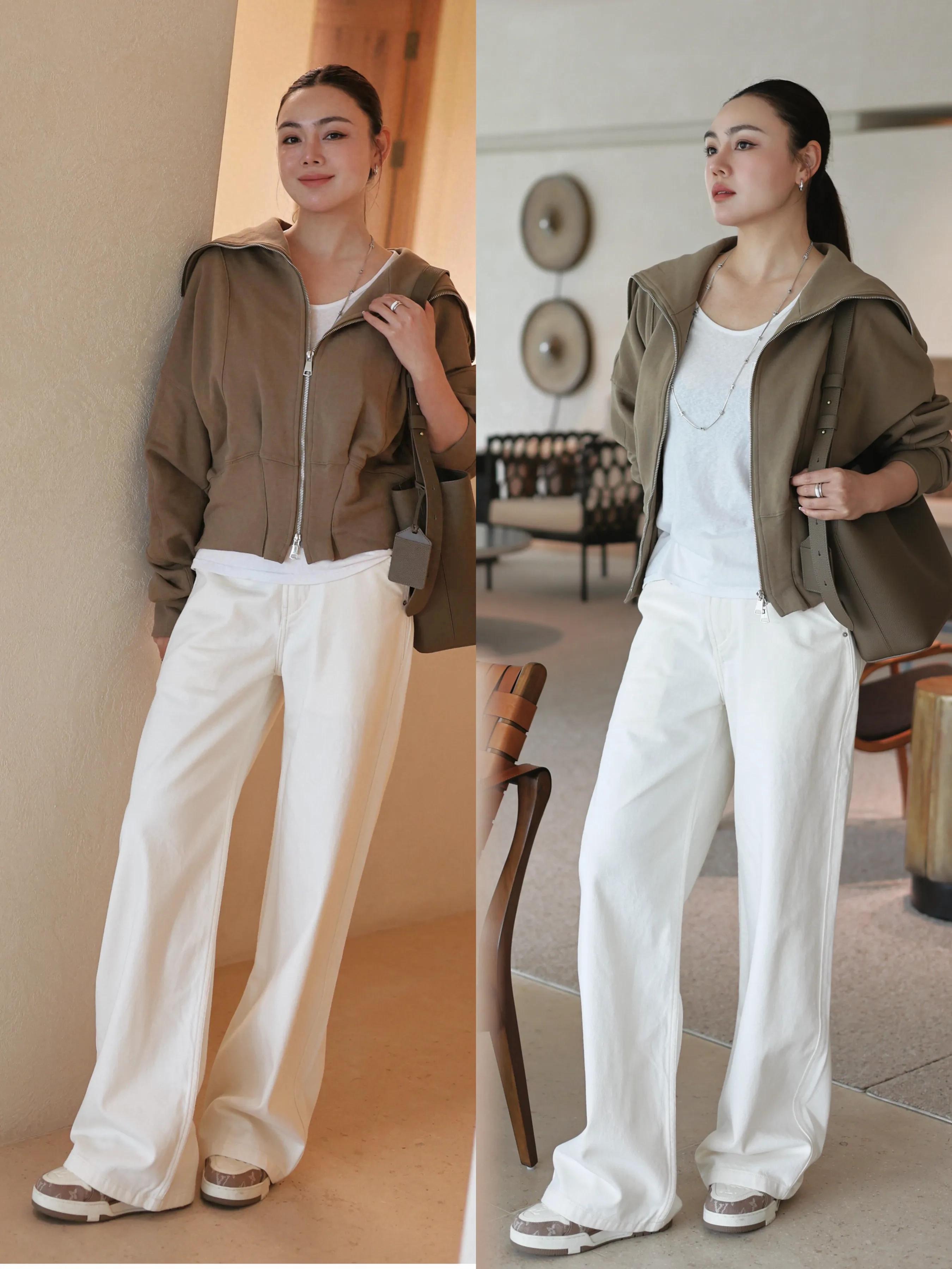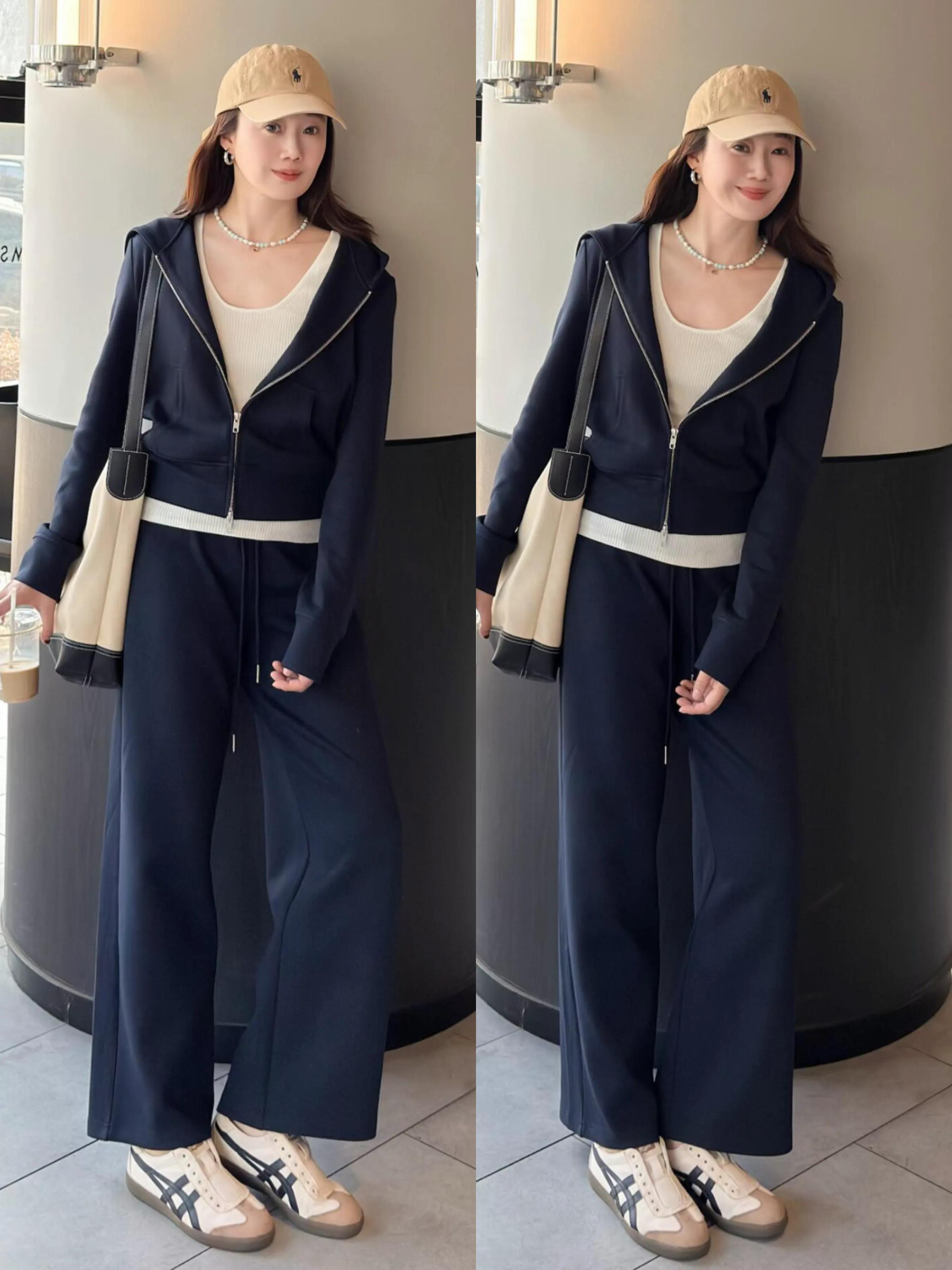 春天可选一件卫衣搭配上白 T 恤和白色直筒阔腿裤。脚踩小板鞋。这样的穿搭休闲时髦。不管是上班、逛街或是约会,穿搭都适配。