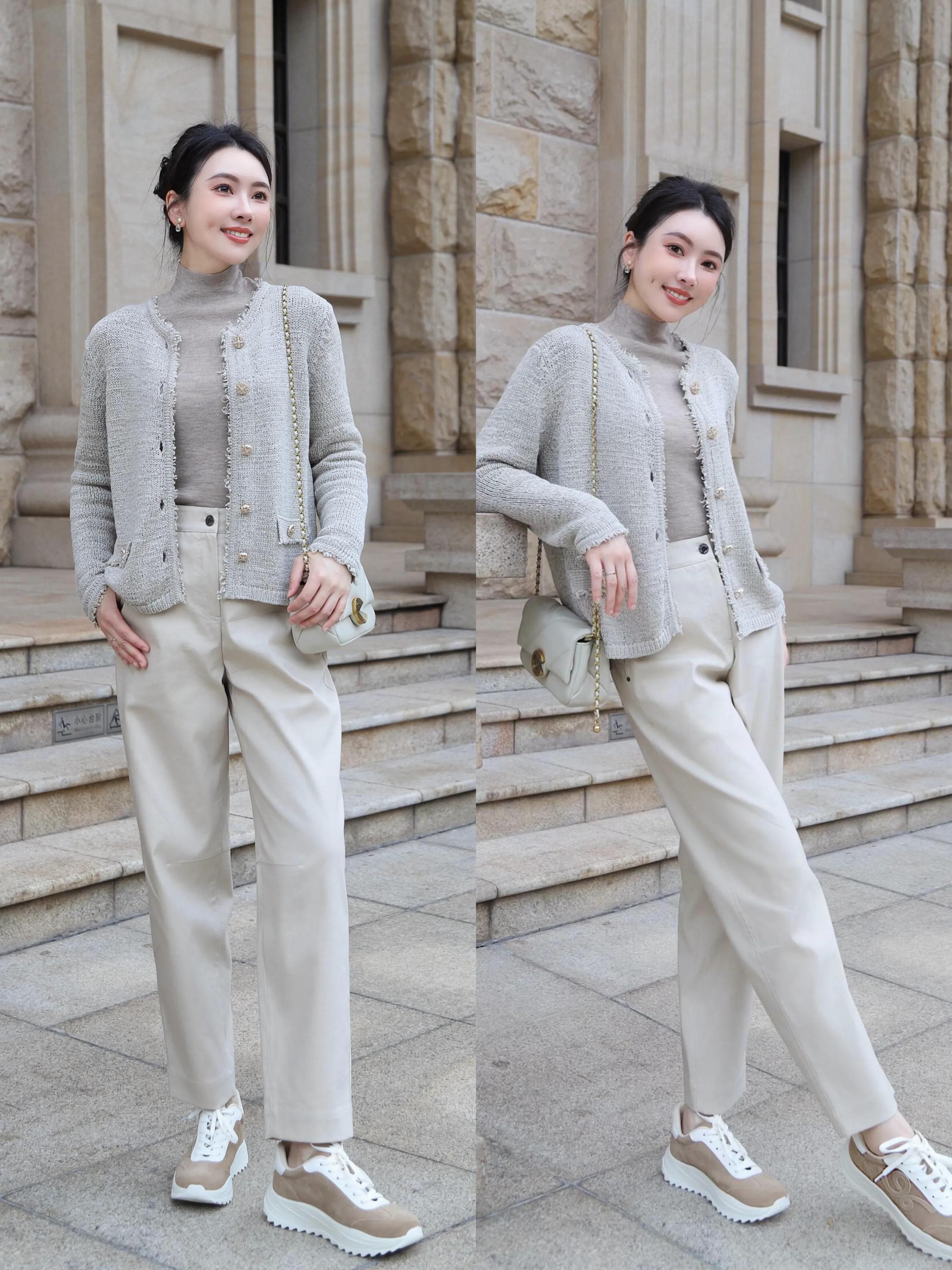 若想要身材变得更流畅,可选一条 9 分直筒裤,配上一双休闲运动板鞋,内搭灰色针织毛衣和一件小香风外套,轻松打造随性又精致的日常穿衣造型,能让身材变得很流畅,简简单单,反而更美。