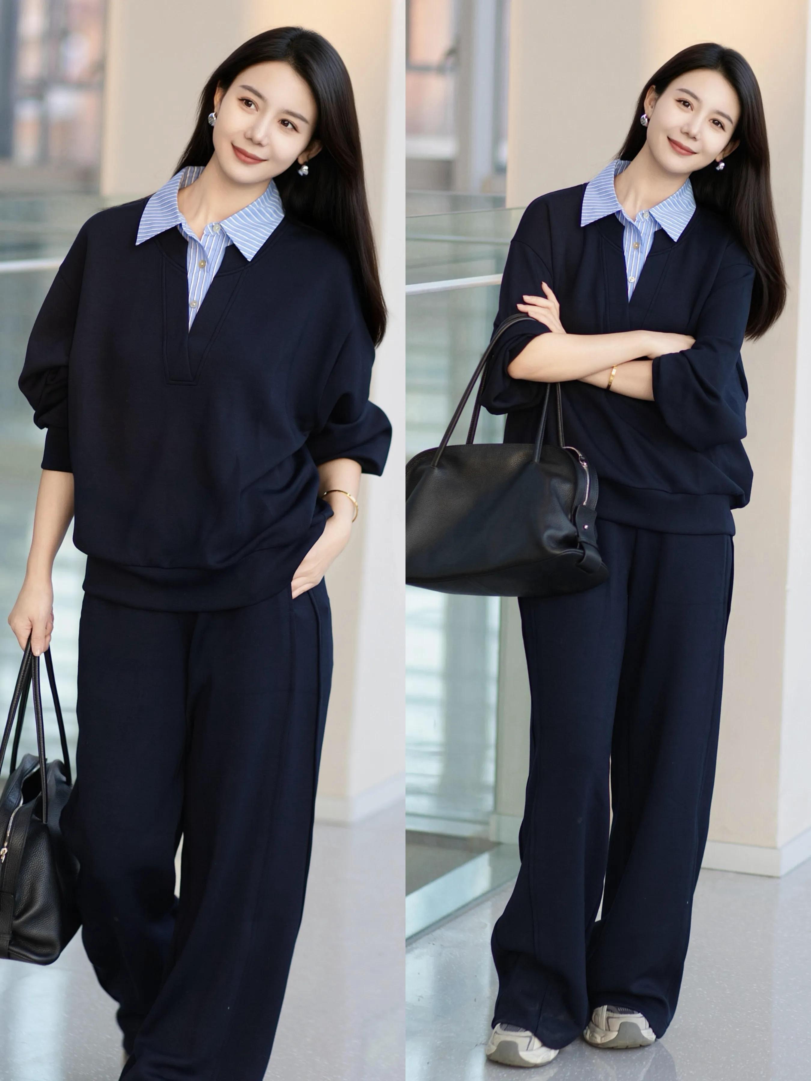 或者是选择经典的德训鞋,配上藏蓝色的卫衣套装,整体穿搭随性又有细节感,日常出街慵懒又时髦,休闲中就带着精致感,所以不必追逐潮流,找到适合你的风格,你也可以秒变成潮人。