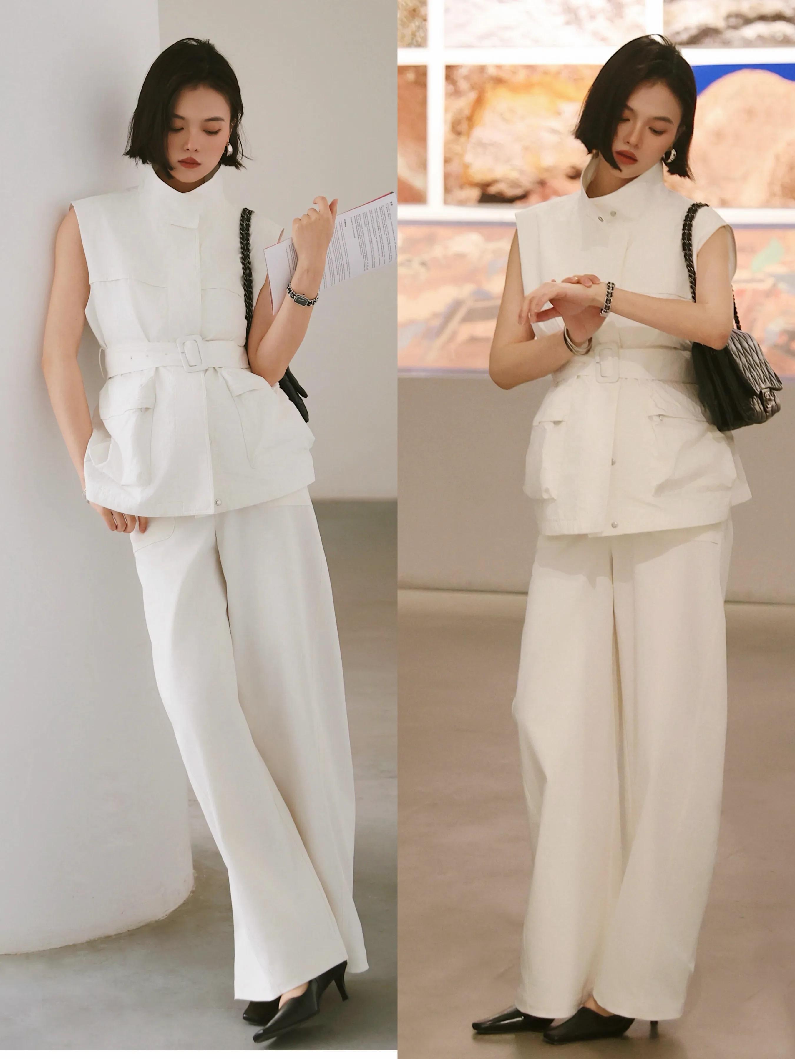 若想让自己的穿衣造型干净利落,懂得做减法搭配很关键。例如上面用白色的无袖夹克配上白色的西装阔腿裤,就可以使得自己又飒又美。