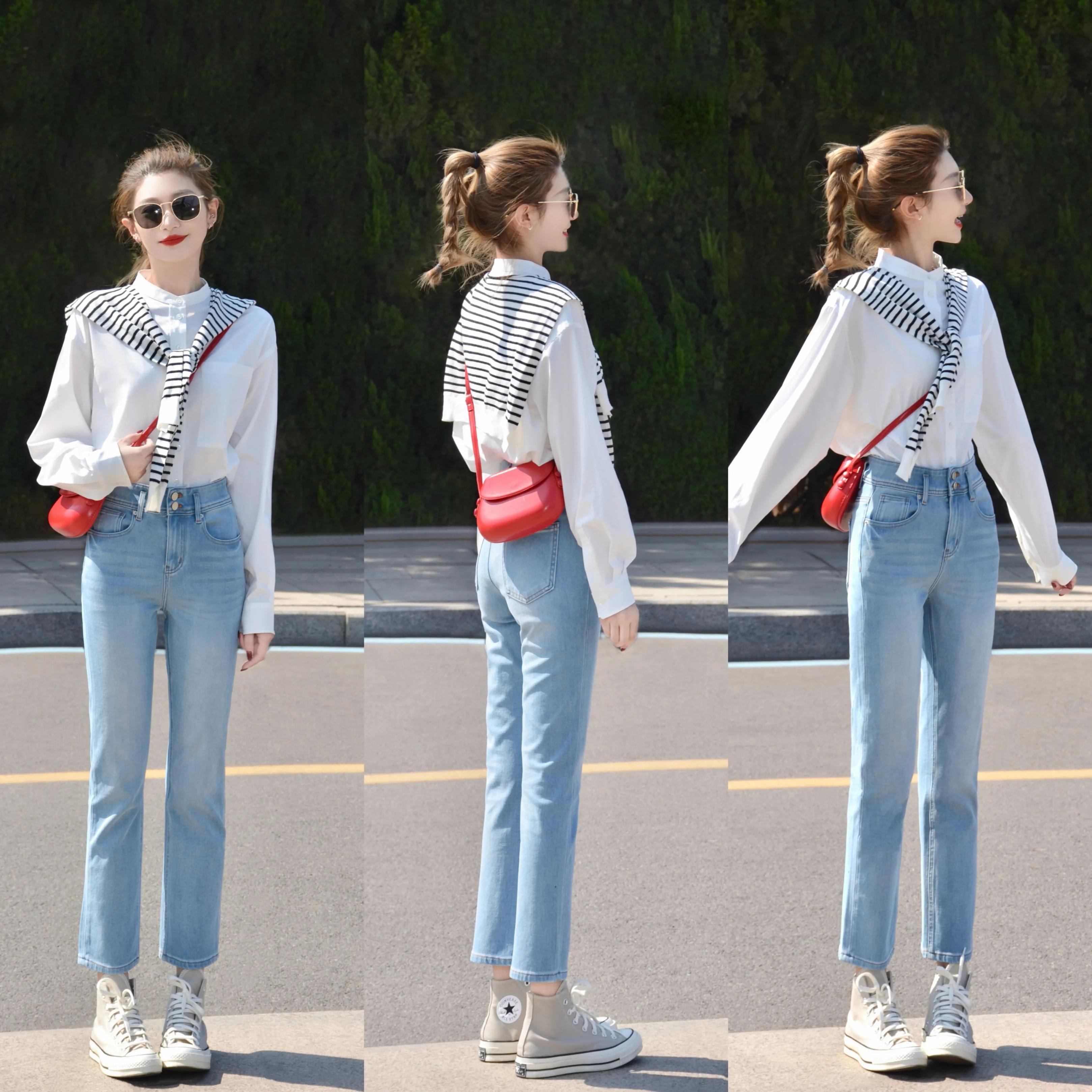 同样是用一件白色的衬衫搭配上蓝色牛仔裤,但是我们脚上穿的是一双帆布鞋时,整体穿搭就会偏休闲风,日常通勤穿搭再适合不过了,干净利落又有气质,精致时尚。