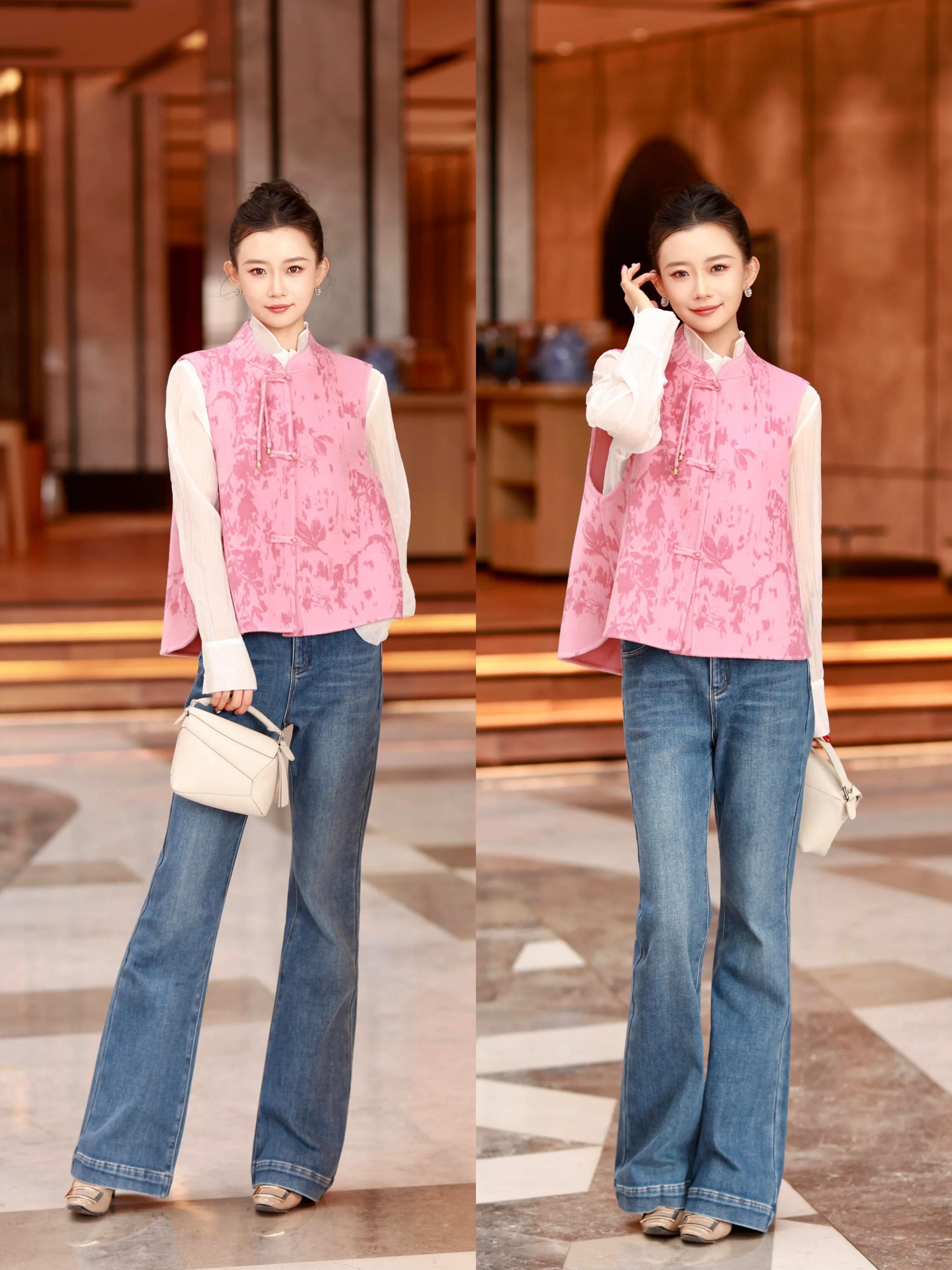 当我们选择一件粉色的新中式外套马甲,搭配一件白色的衬衫和一条牛仔直筒裤,这时可以选择一双低跟单鞋来组合,这样的打扮方式立刻变得很有精致感。