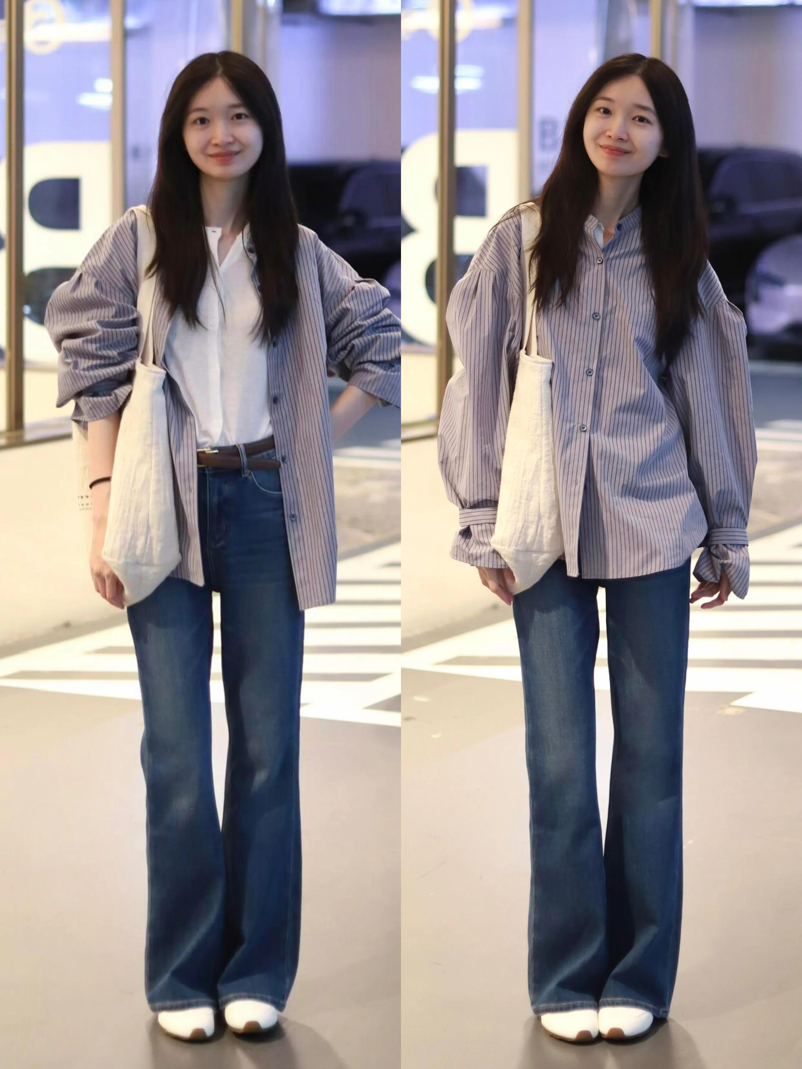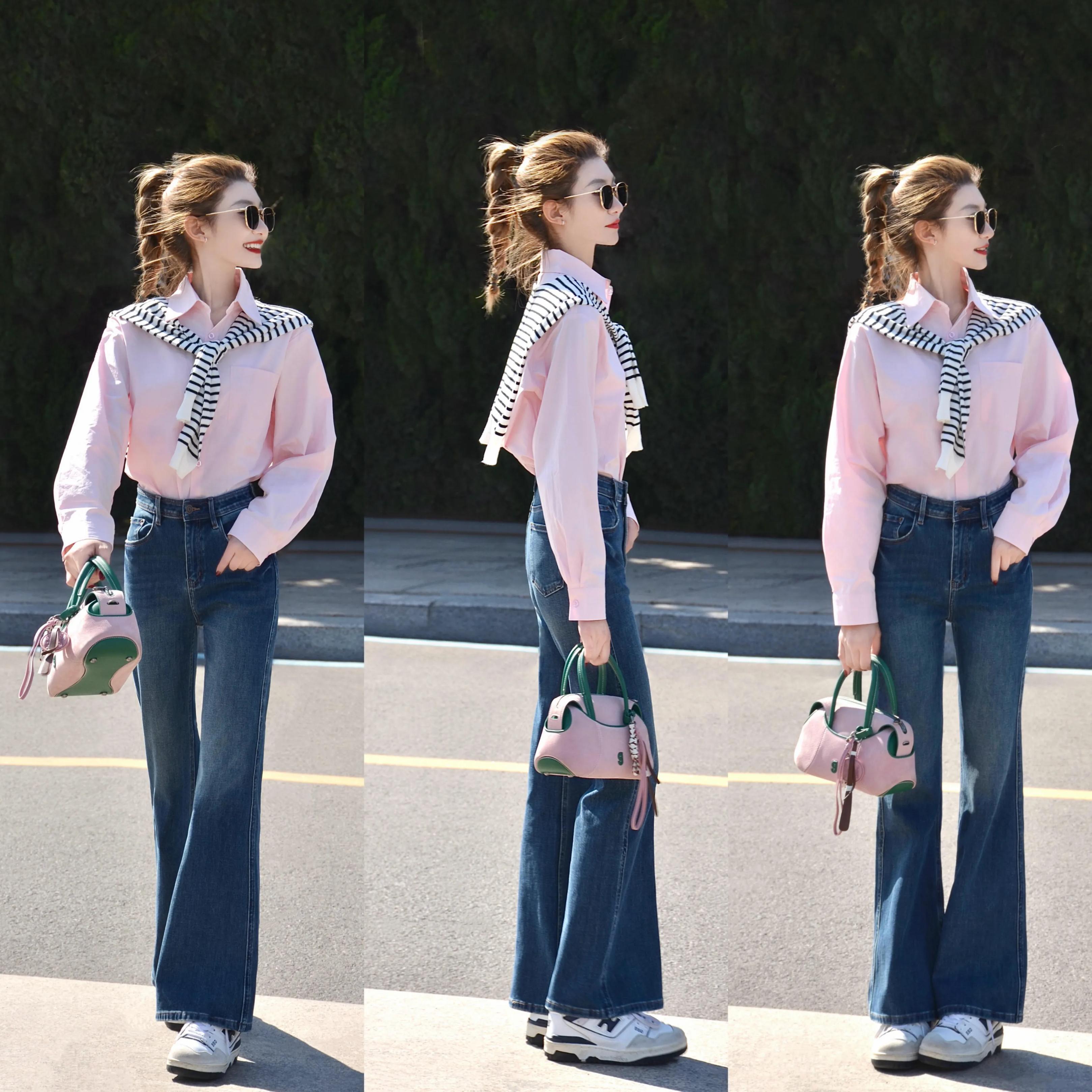 日常穿搭可选一件粉色衬衫配上蓝色微喇叭牛仔裤,脚踩一双板鞋,披上黑白条纹针织衫,扎着高高的三股辫马尾辫发型,自带少女气息显年轻又显活力。