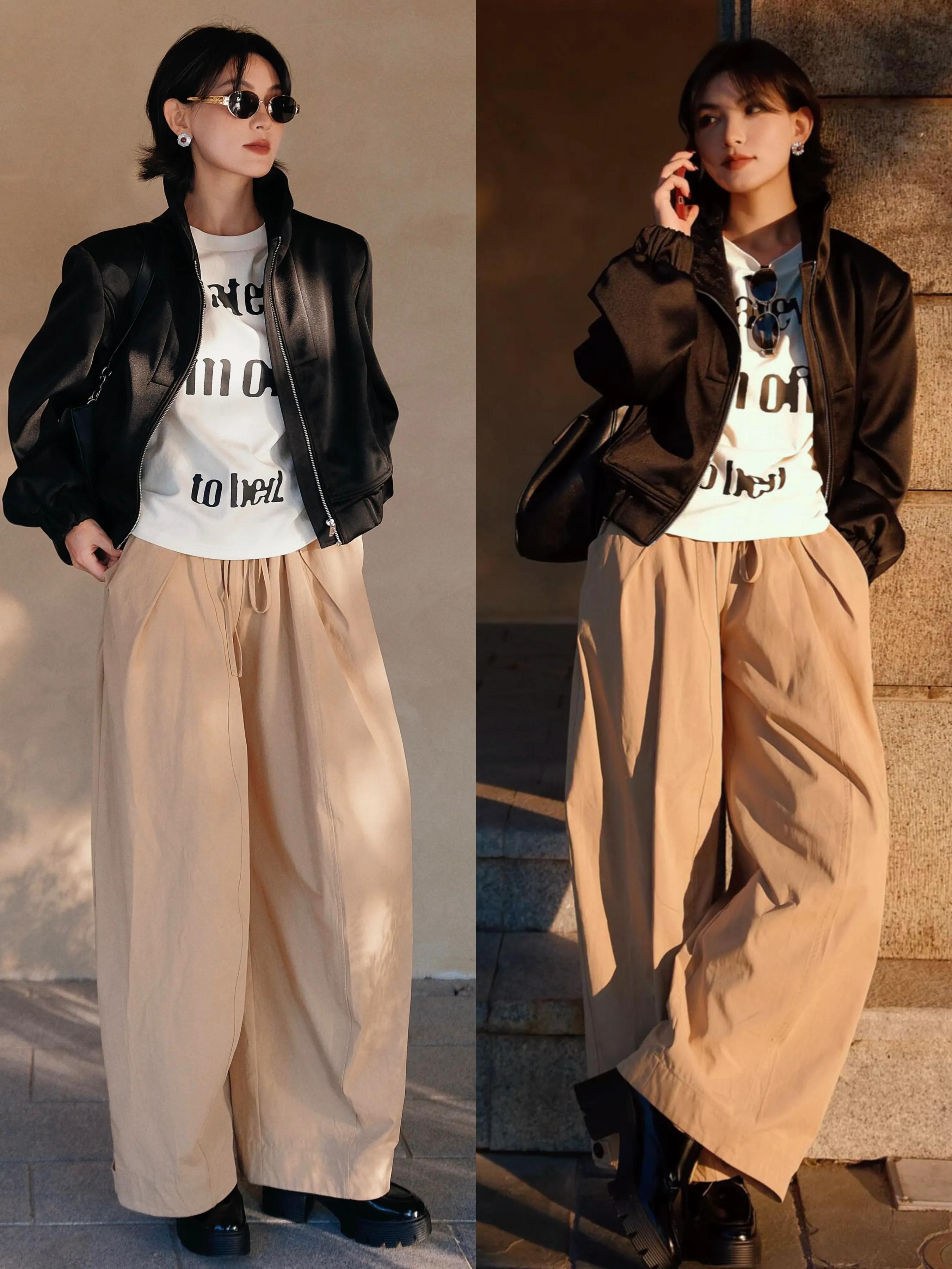用黑色的短外套来搭配上一条卡其色的休闲阔腿裤,就可以瞬间使得身材比例变成三七分。这就是上短下长的搭配方案。脚踩一双粗跟皮鞋。还能使你的下半身腿部线条更流畅。