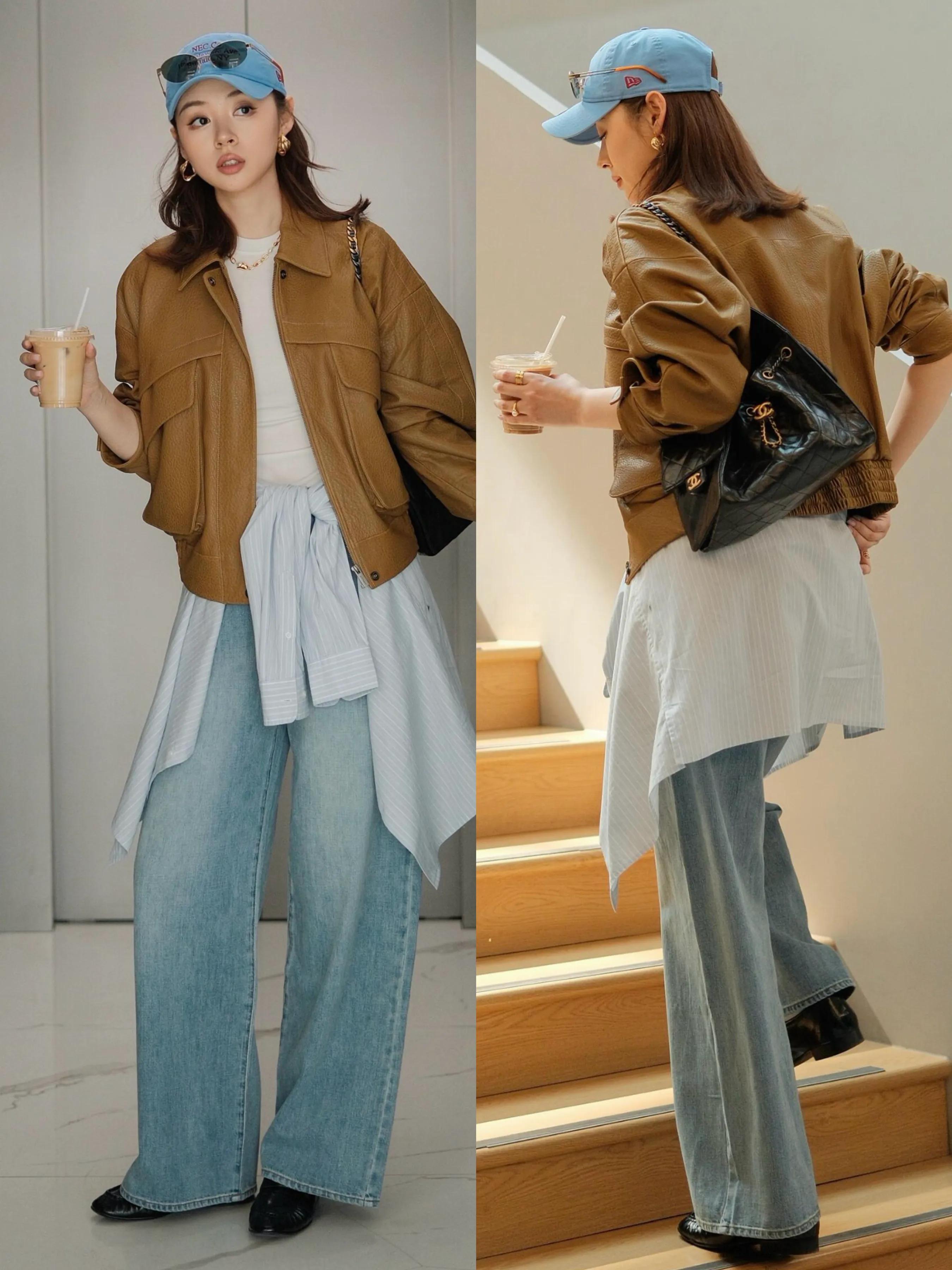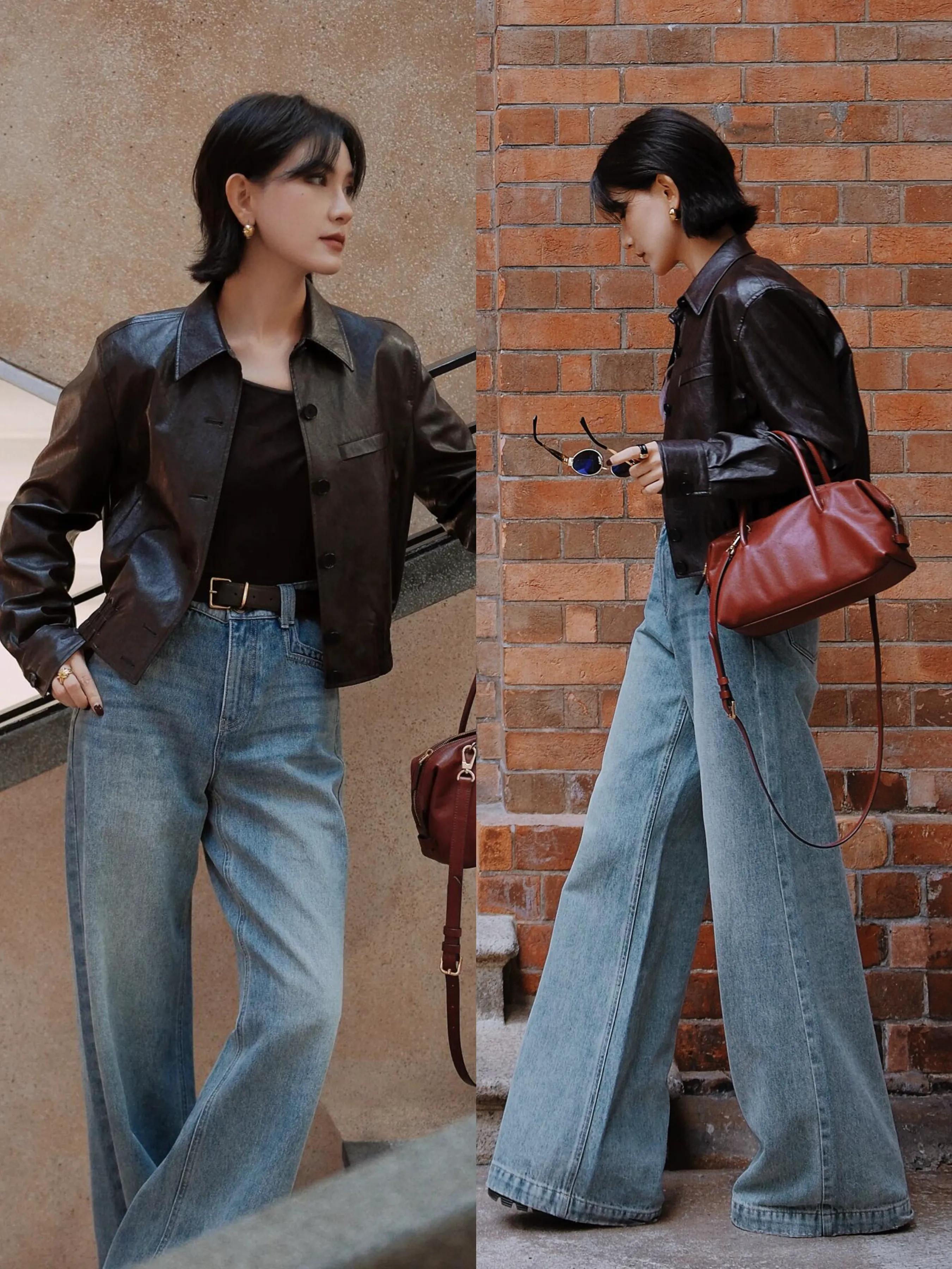 高个子的你完全可以选择这样高腰收腰的牛仔阔腿裤,配上一双黑色高跟鞋和有叛逆感的棕色皮衣外套,让你又酷又美。