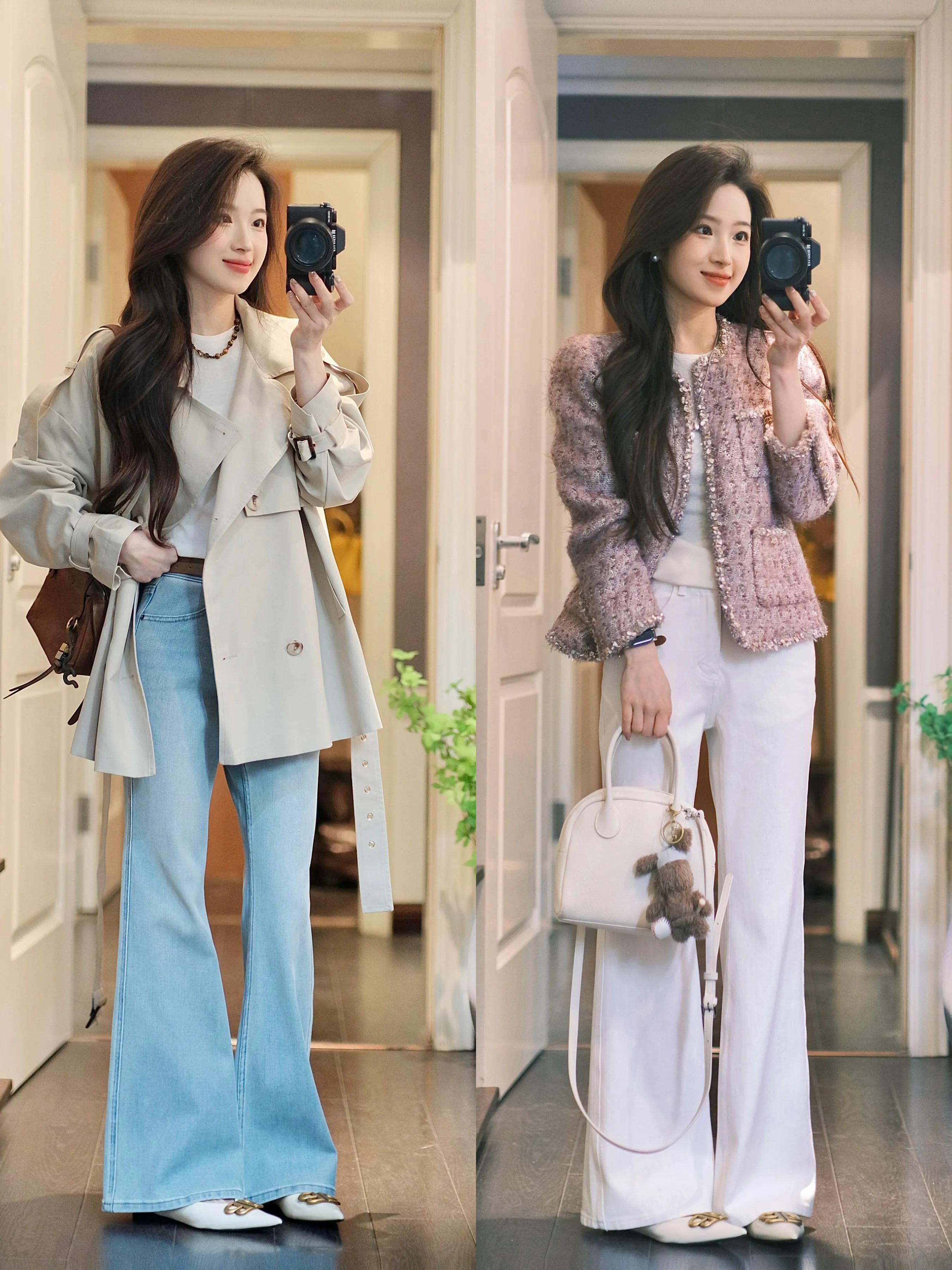 也可以换成白色的西装微喇叭裤,配上尖头单鞋和一件浅粉色的小香风外套,精致又耐看。