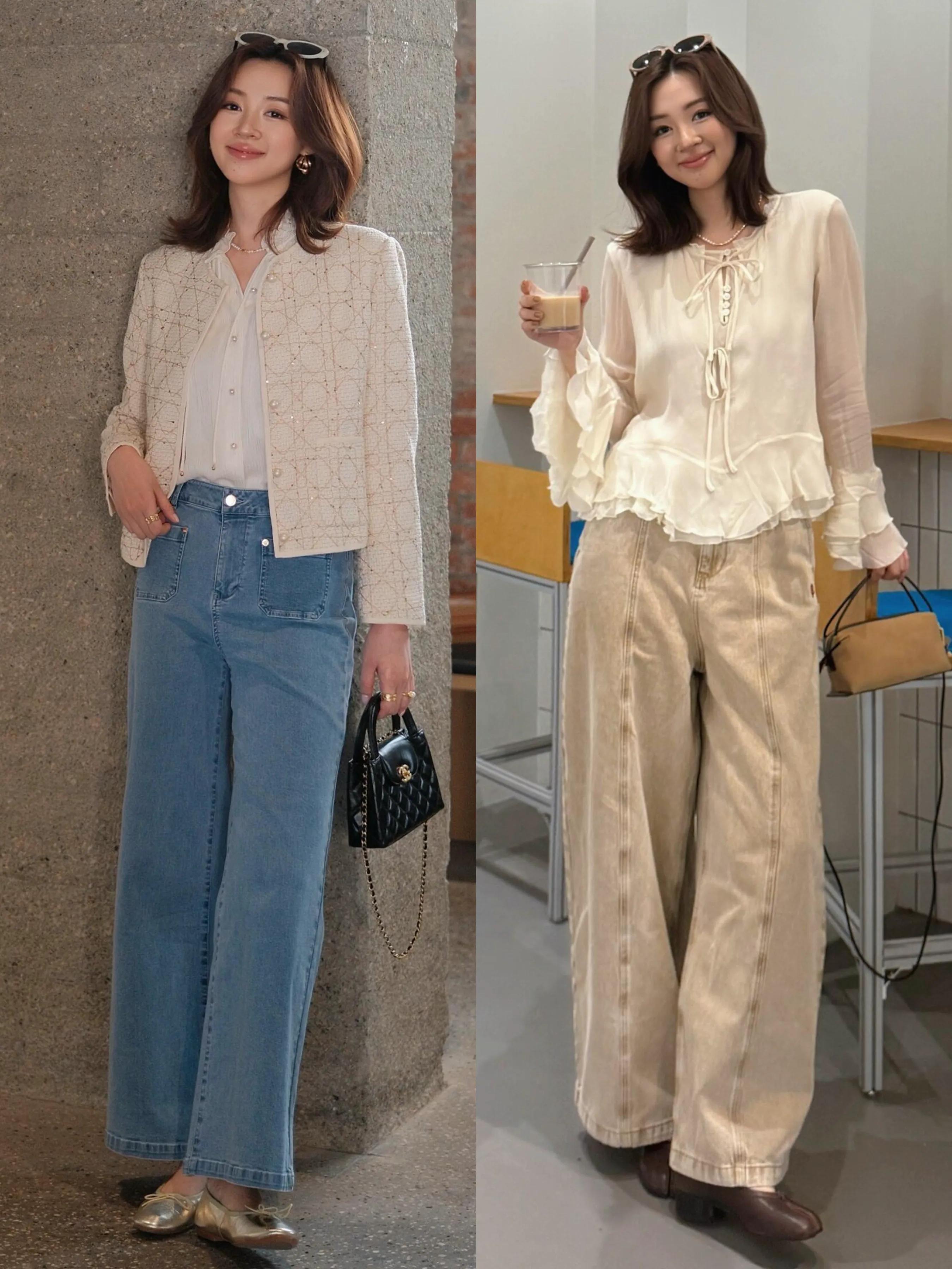 想要变得更温柔,我们可以选择木耳边、袖口和衣角设计的白衬衫,穿在身上能瞬间让人变得很温柔,更有女人味。配上卡其色的牛仔阔腿裤和一双棕色的粗跟短靴,温柔又不失细节,轻松穿出春日的氛围感。
