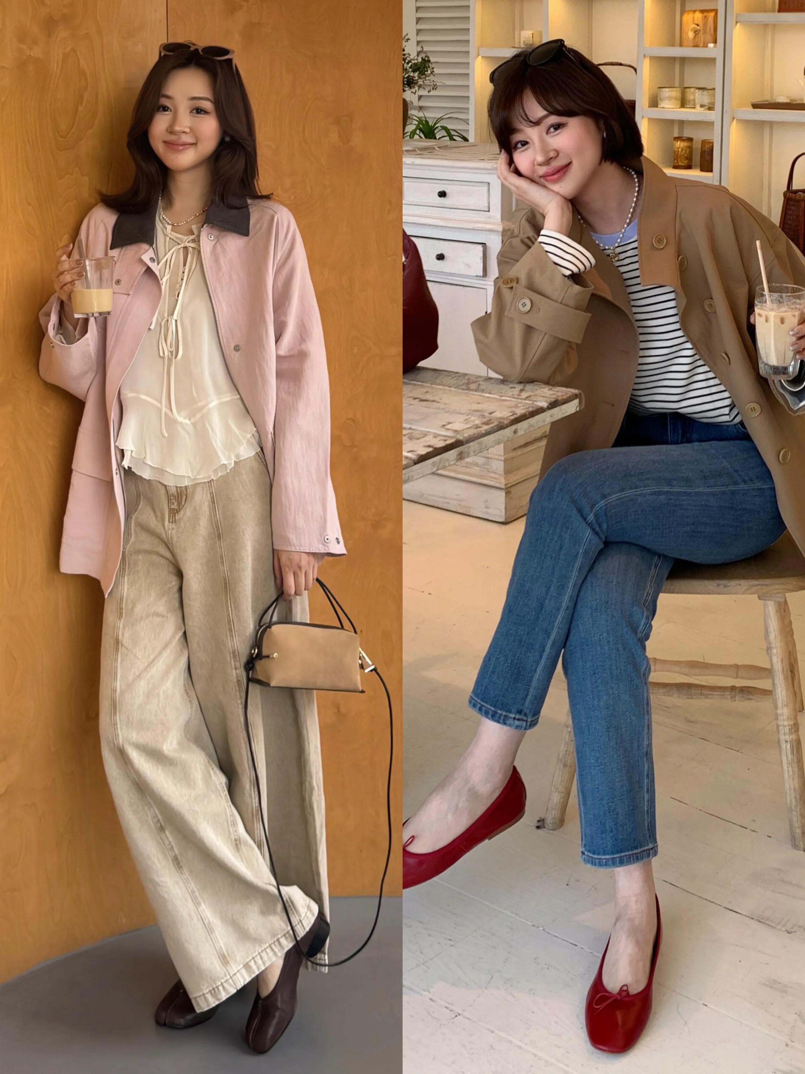 若是偏爱造型更显气场,走起路来自带风,不妨可以选择卡其色的风衣外套,内搭黑白条纹衫和一条蓝色的修身牛仔裤,脚踩红色玛丽珍鞋,瞬间让人变得利落又帅气。
