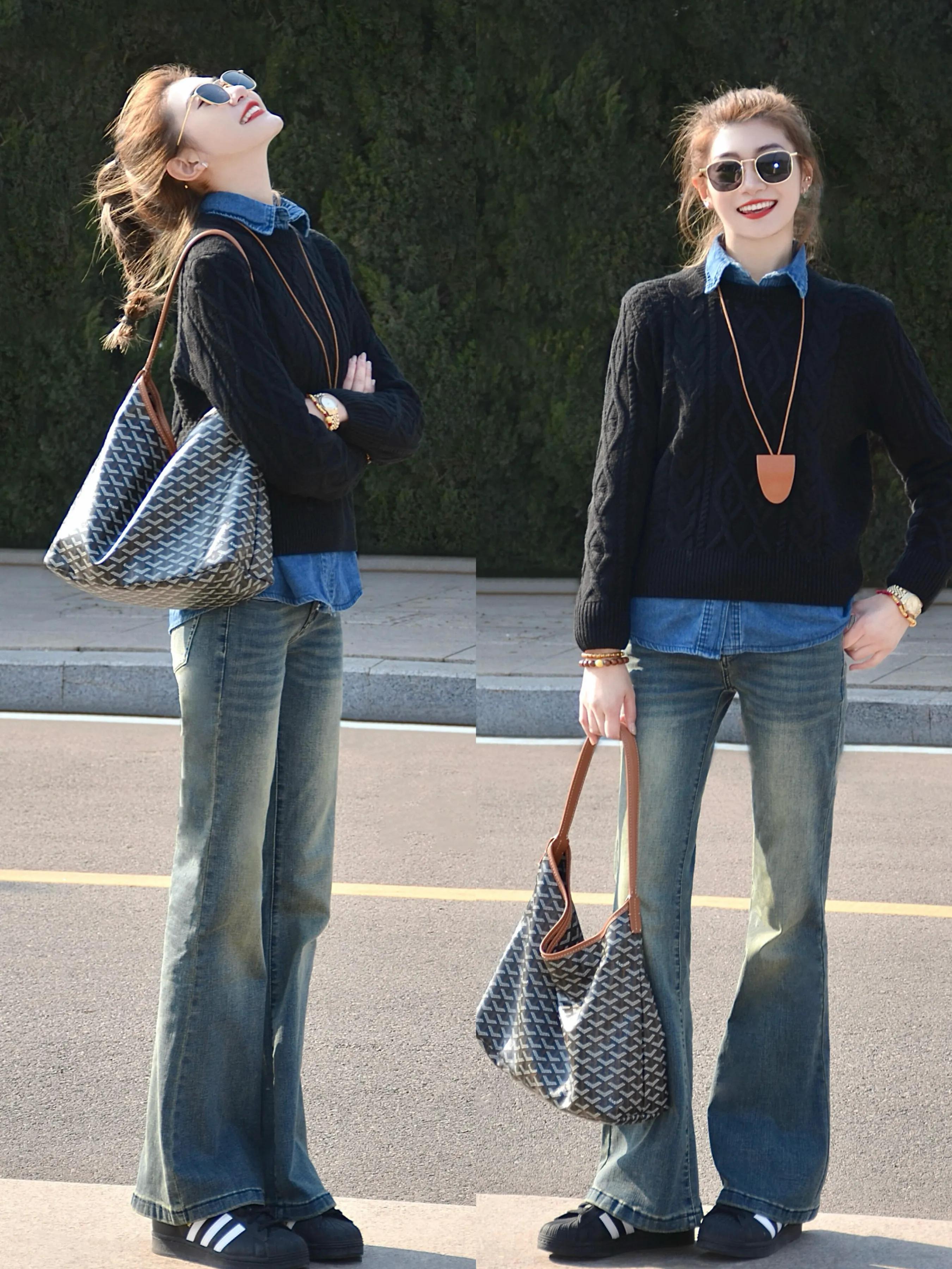 小个子女生选择的裤子,裤脚尽量不要过长,正好在脚踝位置最佳。例如上面这一条微喇叭的牛仔直筒裤和一双黑色的德行鞋组合,经典又耐看,配上蓝色牛仔衬衫和藏蓝色针织毛衣叠穿,层次感分明,俏皮又有活力。