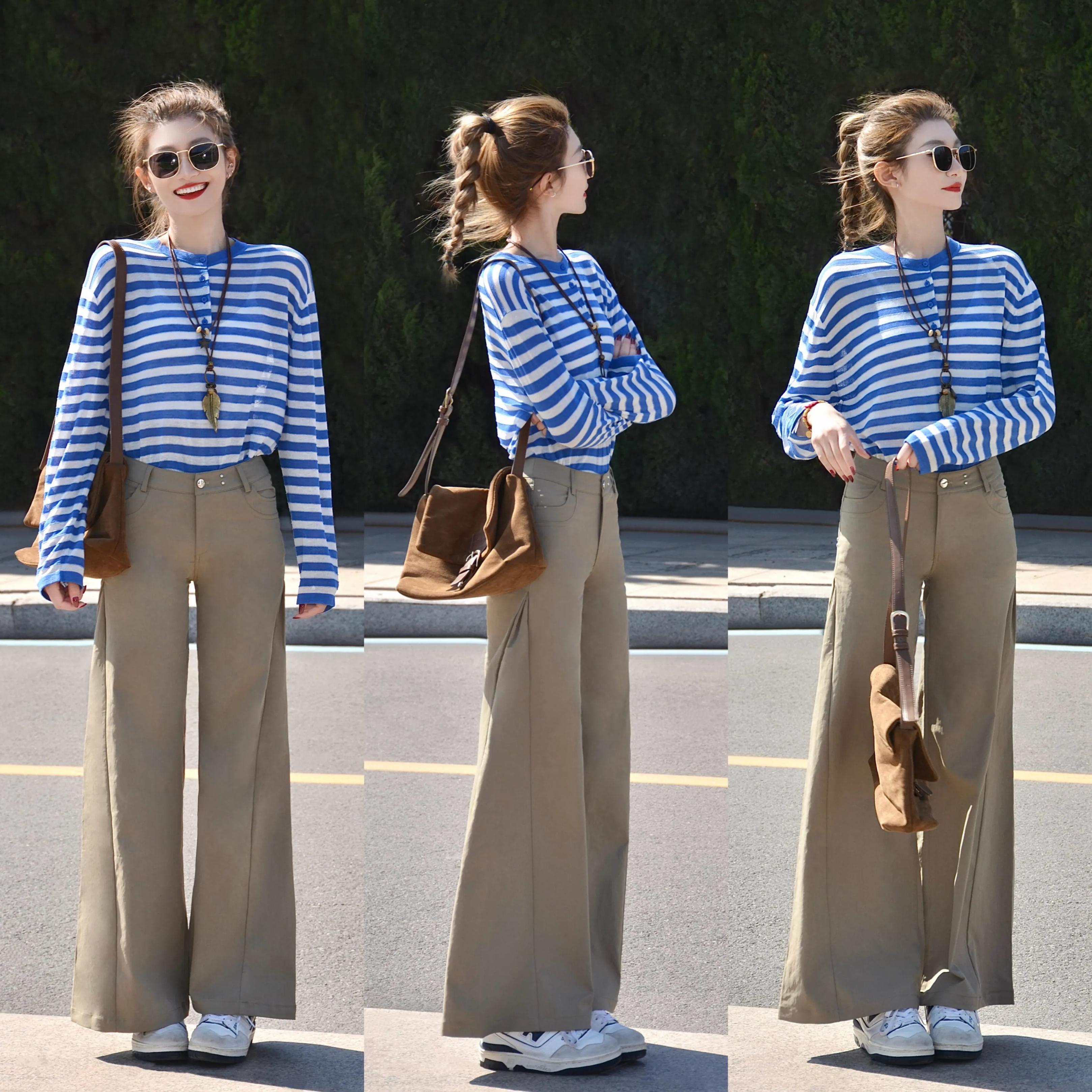Tips④:蓝白条纹针织衫+卡其色阔腿裤
