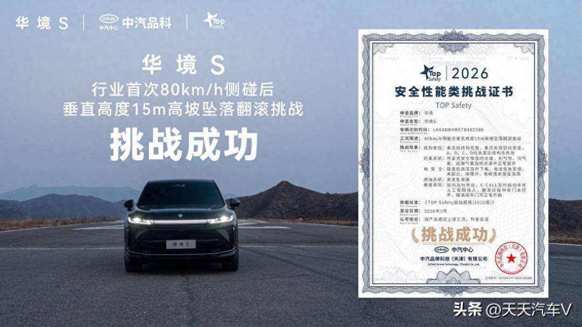 当高速侧撞与坠坡翻滚两大致命事故叠加,乘员能否安然无恙?2026年3月25日,上汽通用五菱与华为深化战略合作的首款旗舰——华境S,公布行业首次 “80km/h侧碰后垂直高度15m高坡坠落翻滚” 极限挑战成果,凭借硬核安全实力成功通关 “超纲大考”,斩获中汽品科 TOP Safety 安全性能证书,重新定义大六座 SUV 安全新标杆。